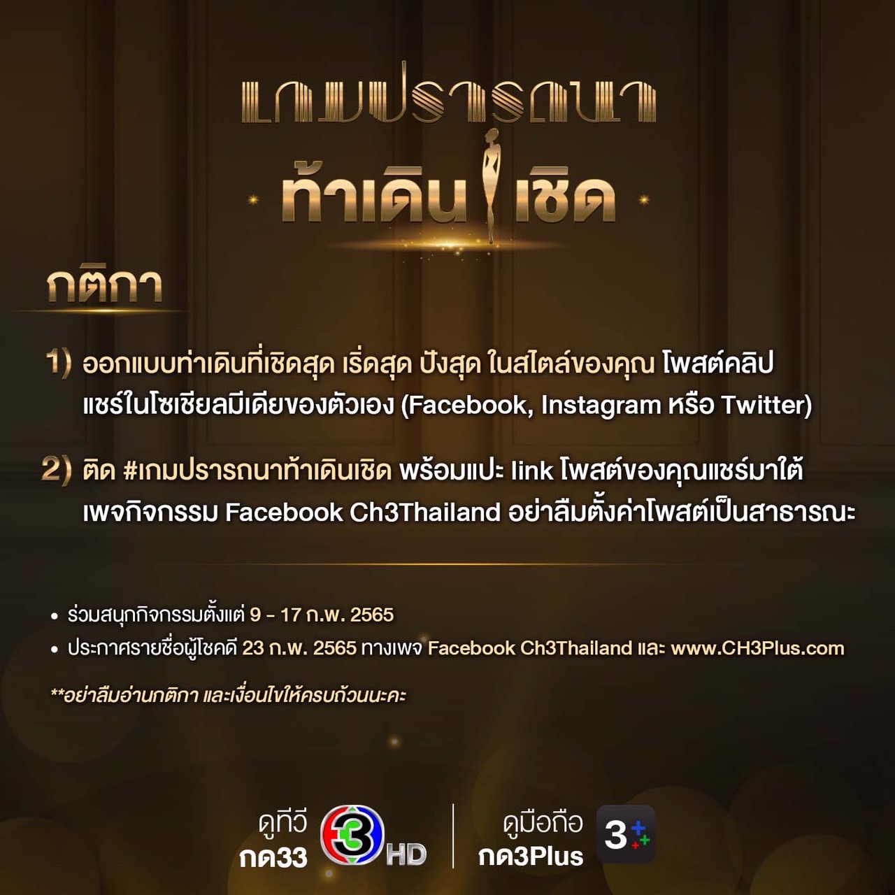 – ติดแฮชแท็ก #เกมปรารถนาท้าเดินเชิด พร้อมแปะ Link โพสต์ของคุณ แชร์มาที่ใต้เพจกิจกรรม Facebook : Ch3Thailand และตั้งค่าโพสต์เป็นสาธารณะ
