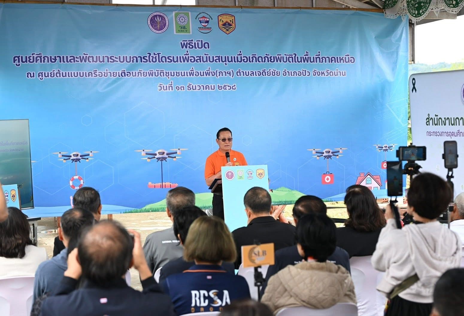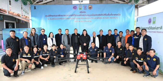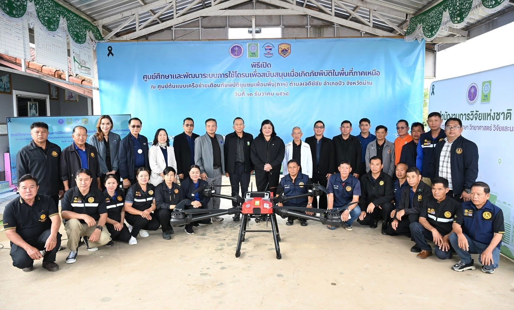 วันที่ 13 ธันวาคม 2568 สำนักงานการวิจัยแห่งชาติ(วช.) กระทรวงการอุดมศึกษา วิทยาศาสตร์ วิจัยและนวัตกรรม ร่วมกับ สมาคมกีฬาเครื่องบินจําลองและวิทยุบังคับ จัด “พิธีเปิดการจัดตั้งศูนย์ศึกษาและพัฒนาระบบการใช้โดรนเพื่อสนับสนุนเมื่อเกิดภัยพิบัติในพื้นที่ภาคเหนือ” โดย ดร.วิภารัตน์ ดีอ่อง ผู้อำนวยการสำนักงานการวิจัยแห่งชาติ เป็นประธาน พร้อมด้วย นายอิทธิฤทธิ์ ยะแสง กํานันตําบลเจดีย์ชัยและหัวหน้าศูนย์การจัดการภัยพิบัติตําบลเจดีย์ชัย กล่าวขอบคุณ, นายพิศิษฐ์ มิตรเกื้อกูล นายกสมาคมกีฬาเครื่องบินจําลองและวิทยุบังคับ กล่าวถึงที่มาของโครงการ, นายสมเกียรติ สุขโข ปลัดอาวุโสอำเภอปัว กล่าวต้อนรับ และผู้ทรงคุณวุฒิ วช. เข้าร่วมในพิธี ณ ศูนย์ต้นแบบเครือข่ายเตือนภัยพิบัติชุมชนเพื่อนพึ่ง(ภาฯ) ตําบลเจดีย์ชัย อําเภอปัว จังหวัดน่าน