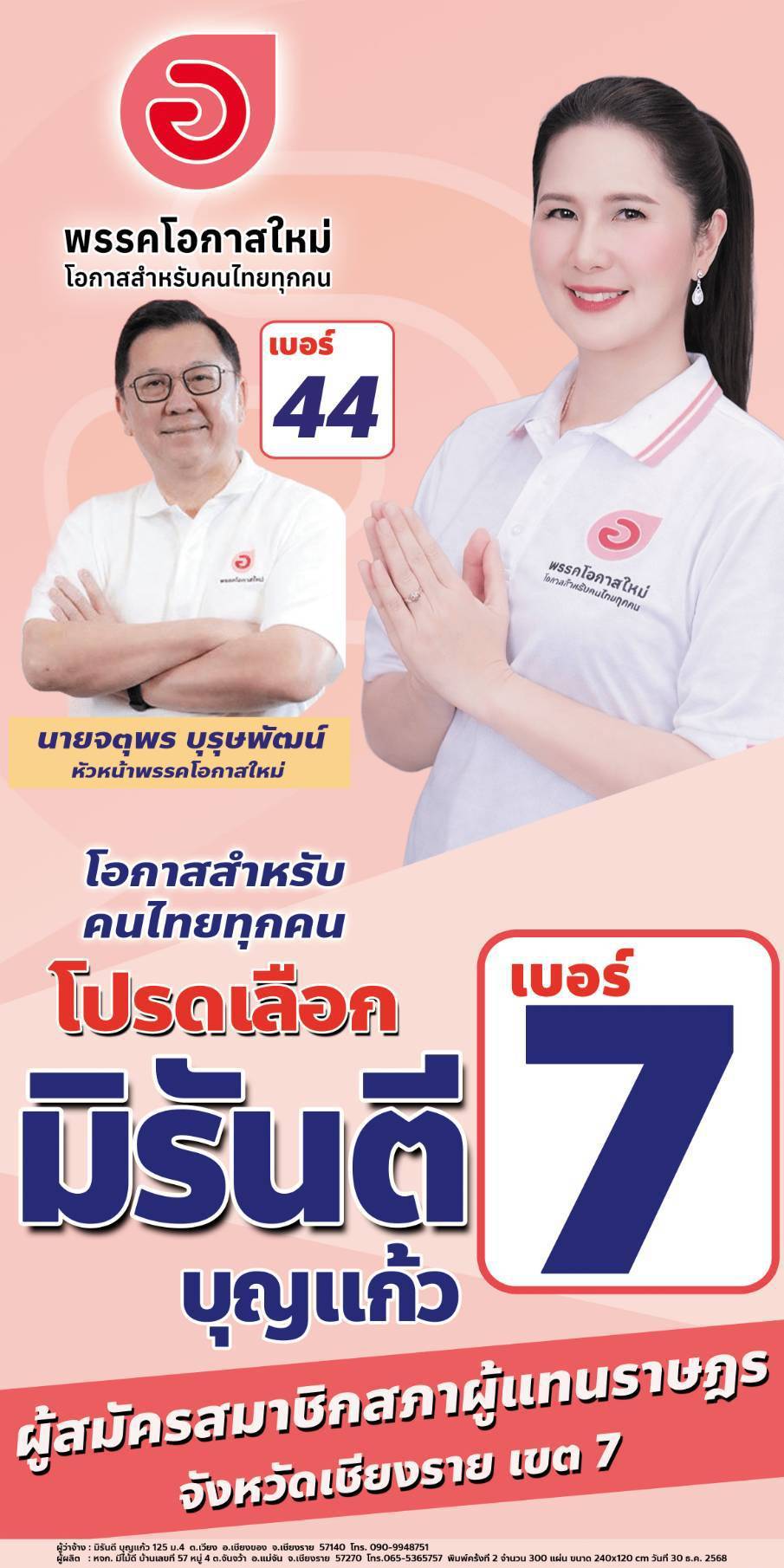 ทำงานการเมืองเพื่อพี่น้องประชาชน และประเทศชาติ ผู้สมัครรับเลือกตั้ง ส.ส. ของพรรคโอกาสใหม่ เบอร์ 7 เขต7 จ.เชียงราย