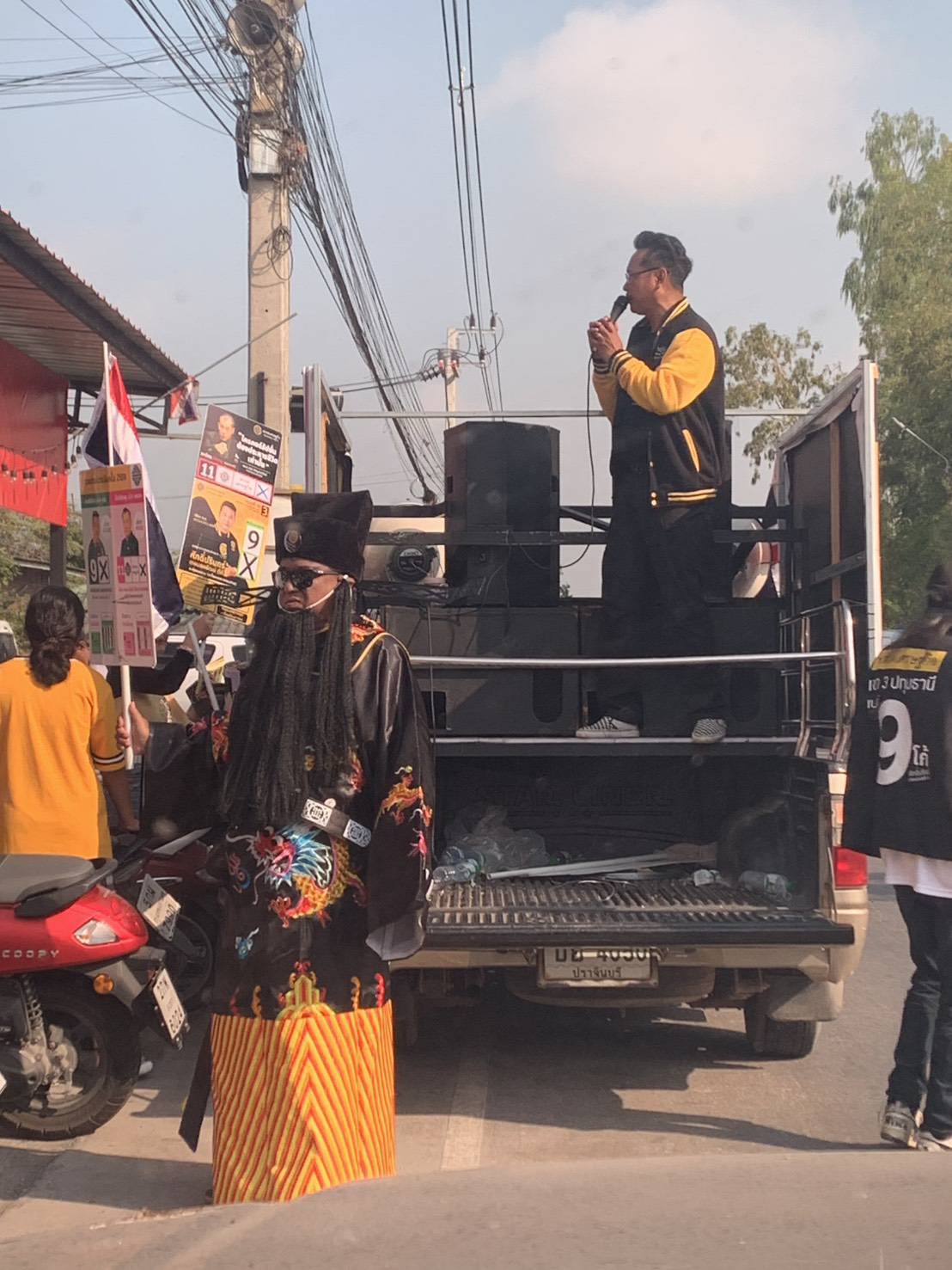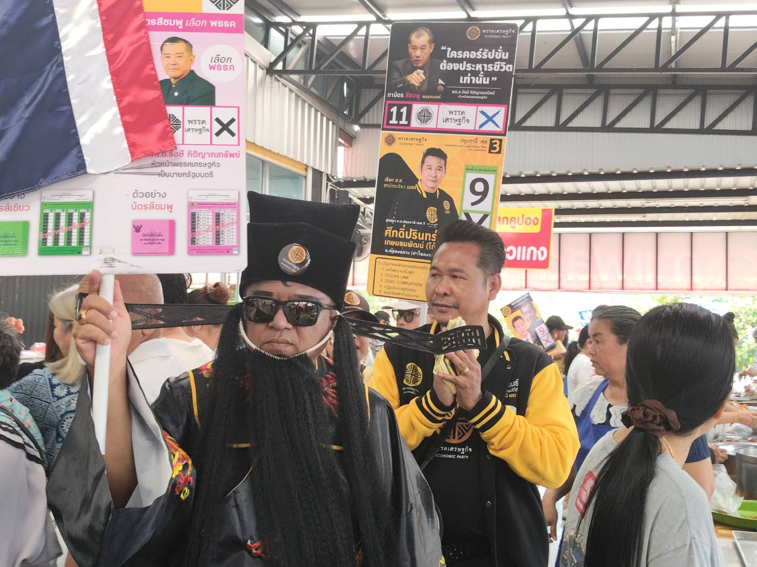 ผู้สมัคร ส.ส.ปทุมธานี เขต 3 พรรคเศรษฐกิจ เบอร์ 9 นำทีมผู้ช่วยหาเสียง แต่งชุด “เปาปุ้นจิ้น” และ สไบไทย ลงพื้นที่หาเสียงโค้งสุดท้าย ที่ ตลาดพี่ญาคนรุม ปากซอย 13/3 ต.คลองสาม อ.คลองหลวง จ.ปทุมธานี