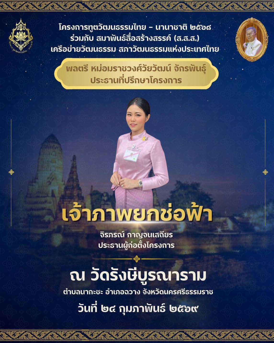 ทั้งนี้ คุณจิรภรณ์ กาญจนเสถียร รองผู้การจังหวัดนนทบุรี มูลนิธิบรรเทาภัย และประธานโครงการทูตวัฒนธรรมไทย – นานาชาติ ๒๕๖๘