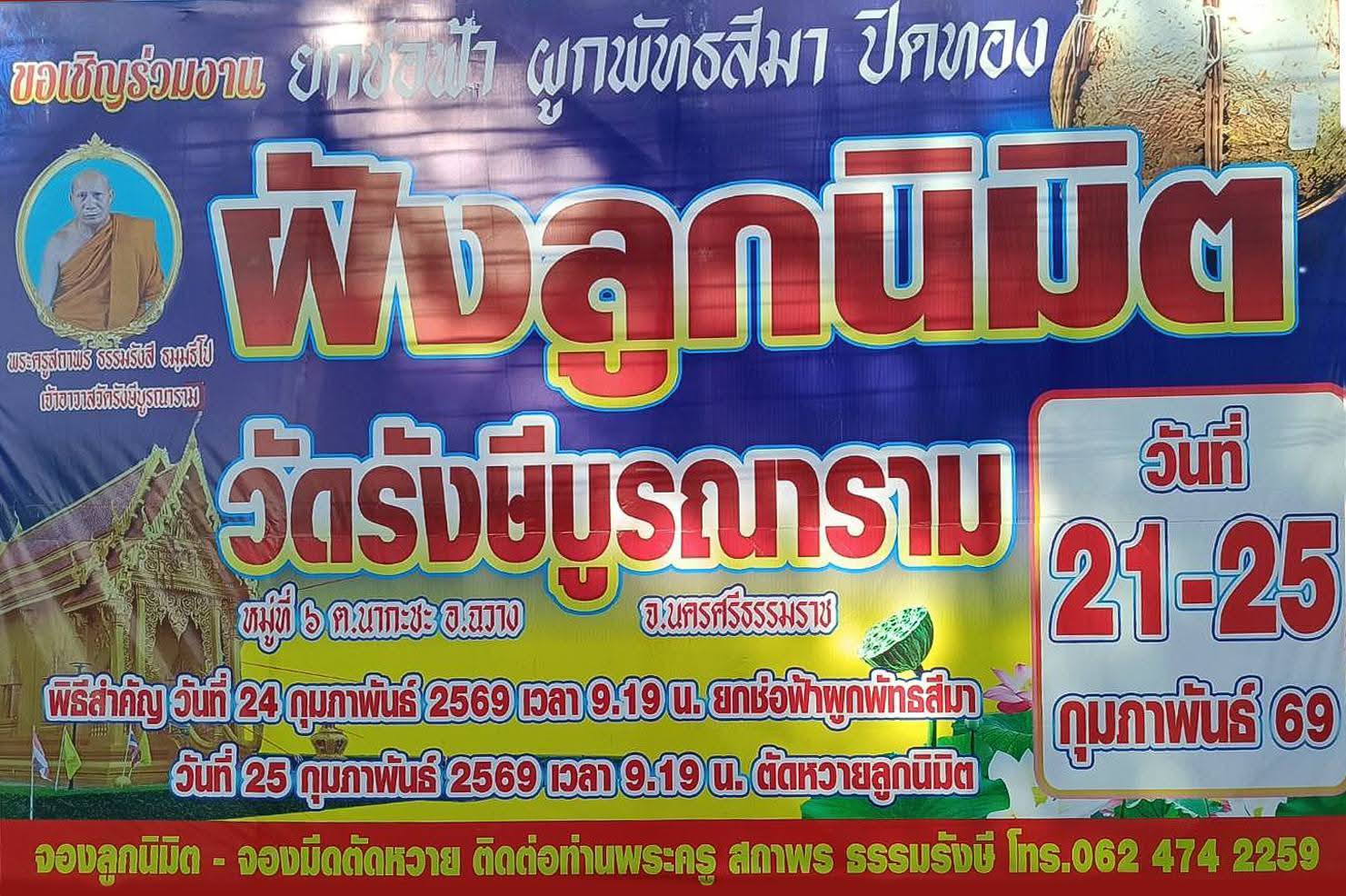 ขอเรียนเชิญพุทธศาสนิกชนผู้มีจิตศรัทธาในพระพุทธศาสนา ร่วมบุญครั้งใหญ่ขอเชิญร่วมเป็นเจ้าภาพ งานยกช่อฟ้า ผูกพัทธสีมา ปิดทอง ฝังลูกนิมิต ณ วัดรังษีบูรณาราม หมู่ ๖ ต.นากะชะ อ.ฉวาง จ.นครศรีธรรมราช