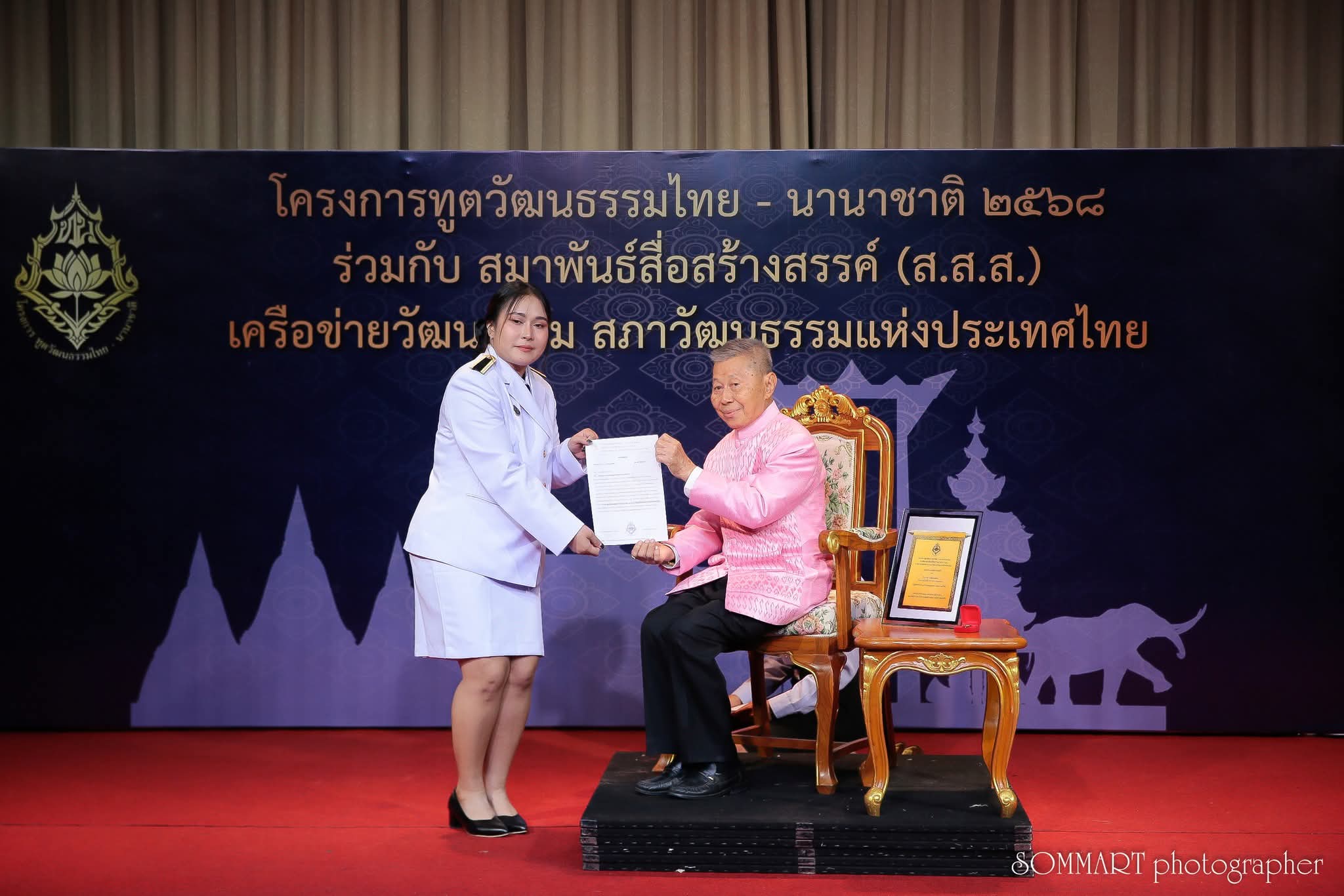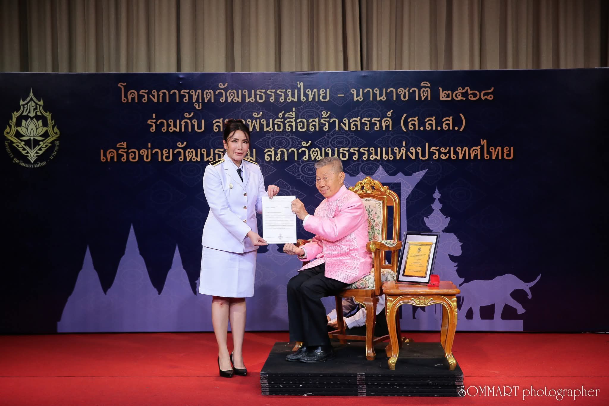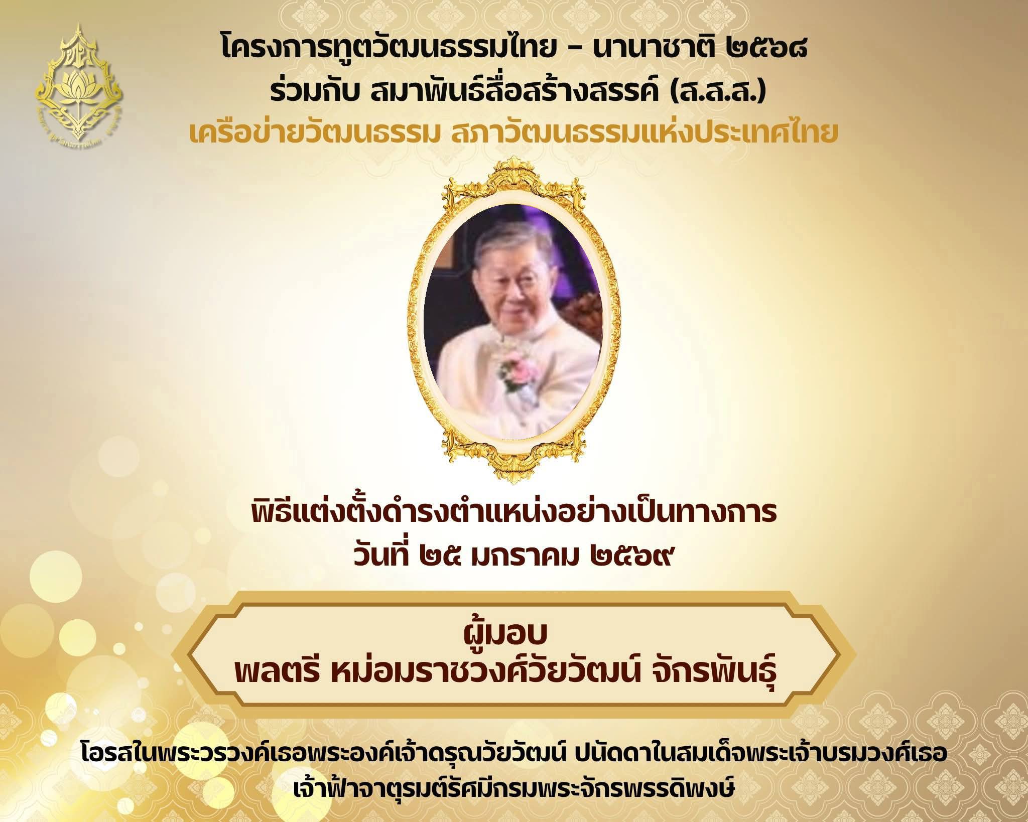 เมื่อวันที่ 25 มกราคม 2569 ที่ผ่านมา โครงการทูตวัฒนธรรมไทย-นานาชาติ ร่วมกับสมาพันธ์สื่อสร้างสรรค์ (ส.ส.ส.) เครือข่ายวัฒนธรรม สภาวัฒนธรรมแห่งประเทศไทย ได้จัดให้มีพิธีการมอบใบแต่งตั้งและเปิดตัวทูตวัฒนธรรมไทย-นานาชาติ โดยมี คุณ”จิรภรณ์ กาญจนเสถียร” ประธานโครงการทูตวัฒนธรรมไทย-นานาชาติ และ “ดร.สมมารถ พึ่งจันดุม”รองประธานสมาพันธ์สื่อสร้างสรรค์ (ส.ส.ส.) เครือข่ายวัฒนธรรม สภาวัฒนธรรมแห่งประเทศไทย พร้อมด้วยตัวแทนทูตวัฒนธรรมไทย-นานาชาติ ซึ่งเป็นทูตฯลฯตัวแทนจากจังหวัดต่างๆในประเทศไทย และเป็นทูตฯลฯตัวแทนจากต่างประเทศหลายประเทศ รวมถึงยุวทูต ที่ได้เดินทางร่วมงานในพิธีการมอบใบแต่งตั้ง มงกุฎ,สายสะพายในครั้งนี้ เป็นจำนวนทั้งสิ้น 78 คน