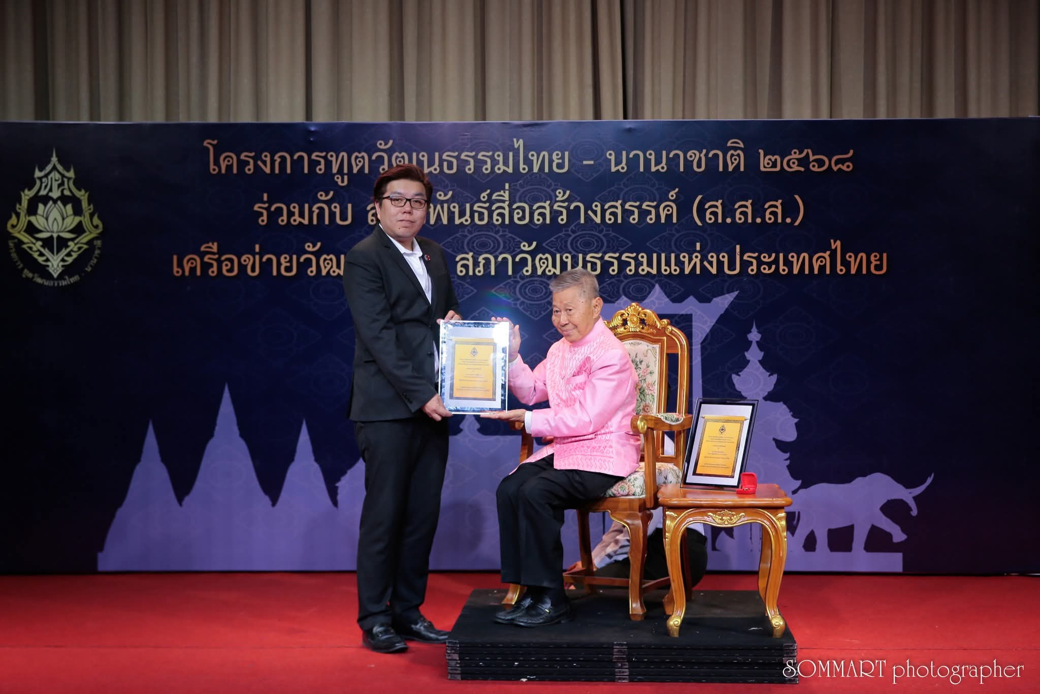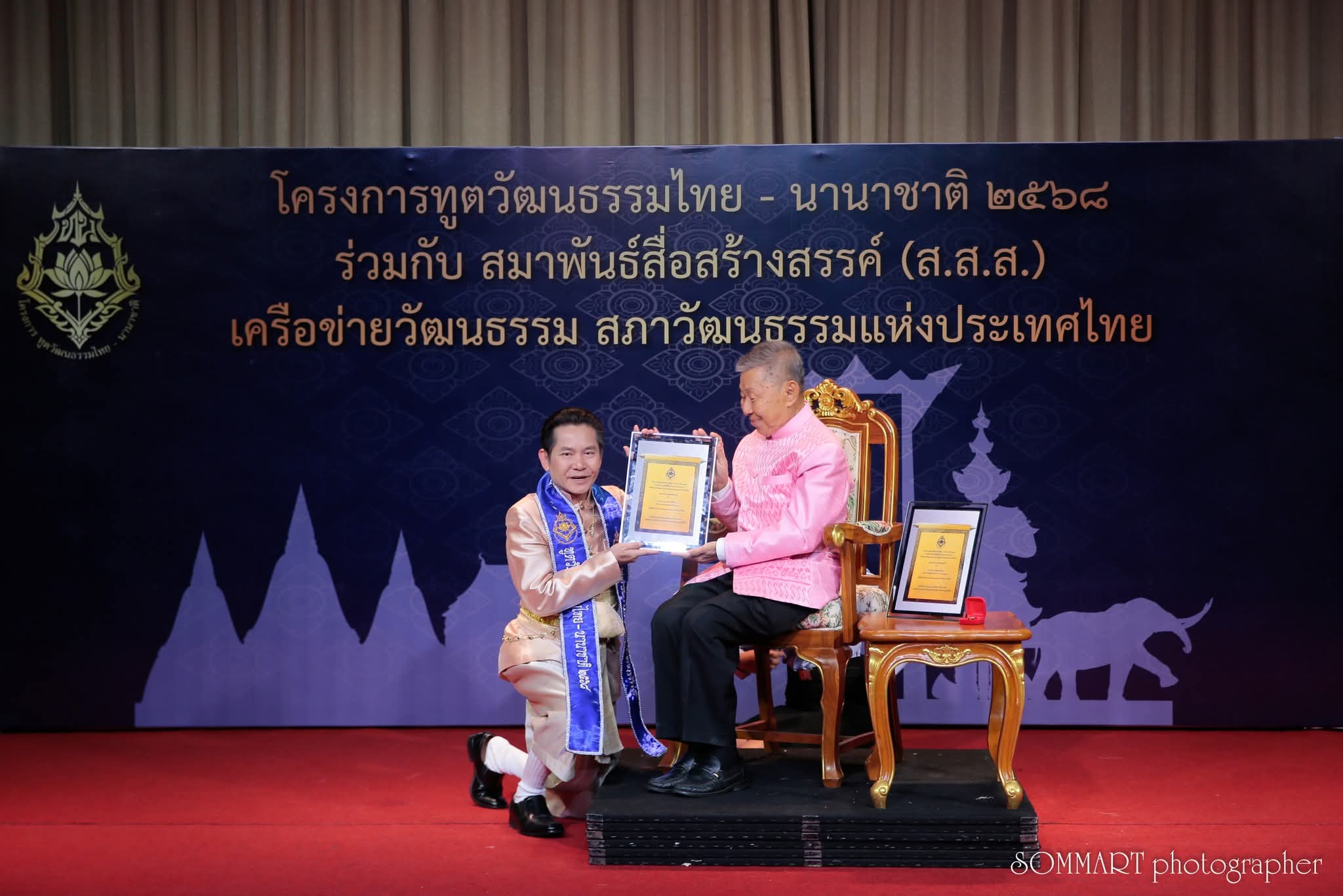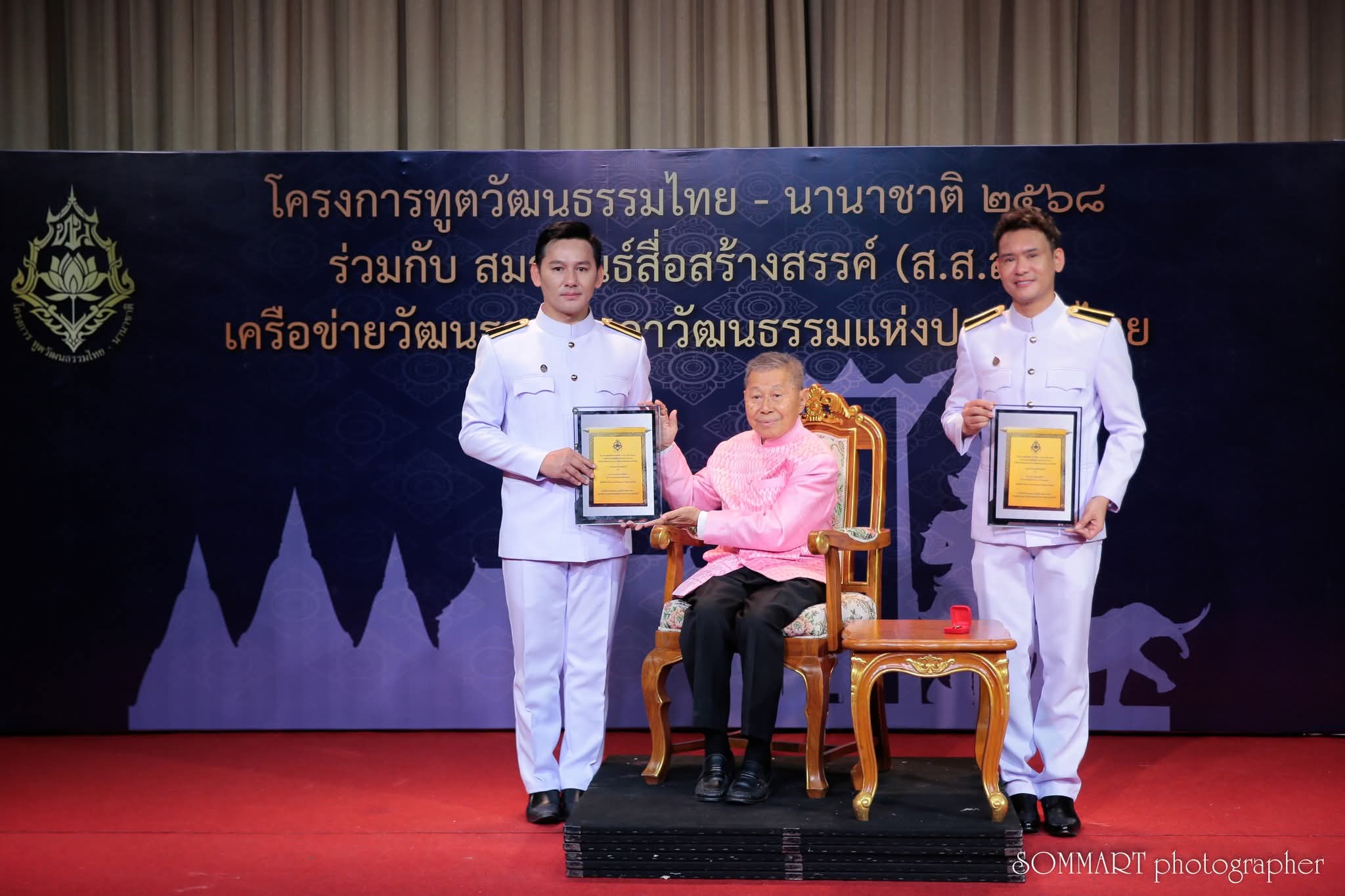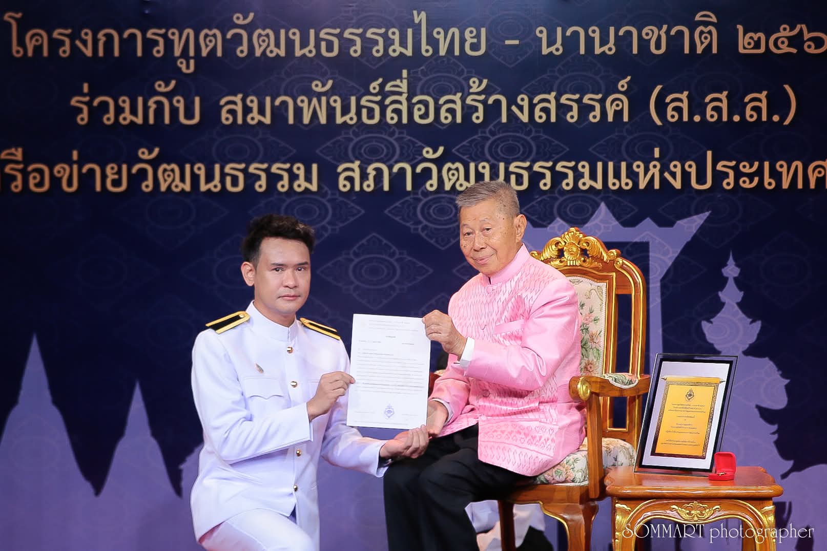 สำหรับงานพิธีการมอบใบแต่งตั้งทูตฯลฯ ครั้งนี้ทางคณะผู้จัดงานได้รับความเมตตาจาก ท่านพลตรีหม่อมราชวงค์วัยวัฒน์ จักรพันธ์ โอรสในพระวรวงค์เธอพระองค์เจ้าดรุณวัยวัยวัฒน์ ปนัดดาในสมเด็จพระเจ้าบรมวงศ์เธอเจ้าฟ้าจาตุรมต์รัศมีกรมพระจักรพรรดิพงษ์ ประธานสภาประชาชนแห่งชาติ เป็นผู้มอบใบแต่งตั้งทูตวัฒนธรรมไทย-นานาชาติ ร่วมกับสมาพันธ์สื่อสร้างสรรค์(ส.ส.ส.)เครือข่ายวัฒนธรรม สภาวัฒนธรรมแห่งประเทศไทย ณ.วังสวนสุนันทา
