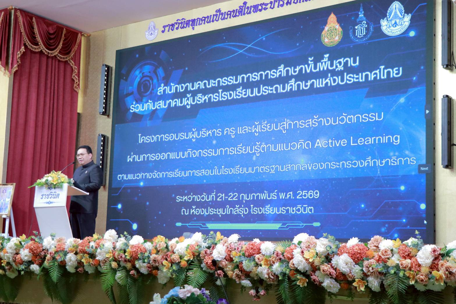 เมื่อวันที่ 21 กุมภาพันธ์ 2569 ที่ โรงเรียนราชวินิต สำนักงานเขตพื้นที่การศึกษาประถมศึกษากรุงเทพมหานคร(สพป.กทม.)สำนักงานคณะกรรมการการศึกษาขั้นพื้นฐาน ร่วมกับ สมาคมผู้บริหารโรงเรียนประถมศึกษาแห่งประเทศไทย จัดโครงการอบรมเชิงปฏิบัติการผู้บริหาร ครู และผู้เรียนสู่การสร้างนวัตกรรมเน้นกระบวนการคิดขั้นสูงเชิงระบบ ผ่านการออกแบบกิจกรรมการเรียนรู้ตามแนวคิด Active Learning ตามแนวทางจัดการเรียนการสอนในโรงเรียนตามมาตรฐานสากลของกระทรวงศึกษาธิการ โดยมีผู้บริหารสถานศึกษาและครู รวมประมาณ 300 คน จากทุกโรงเรียนในสังกัด สพป.กทม. และเครือข่ายสมาคมฯเข้าร่วม