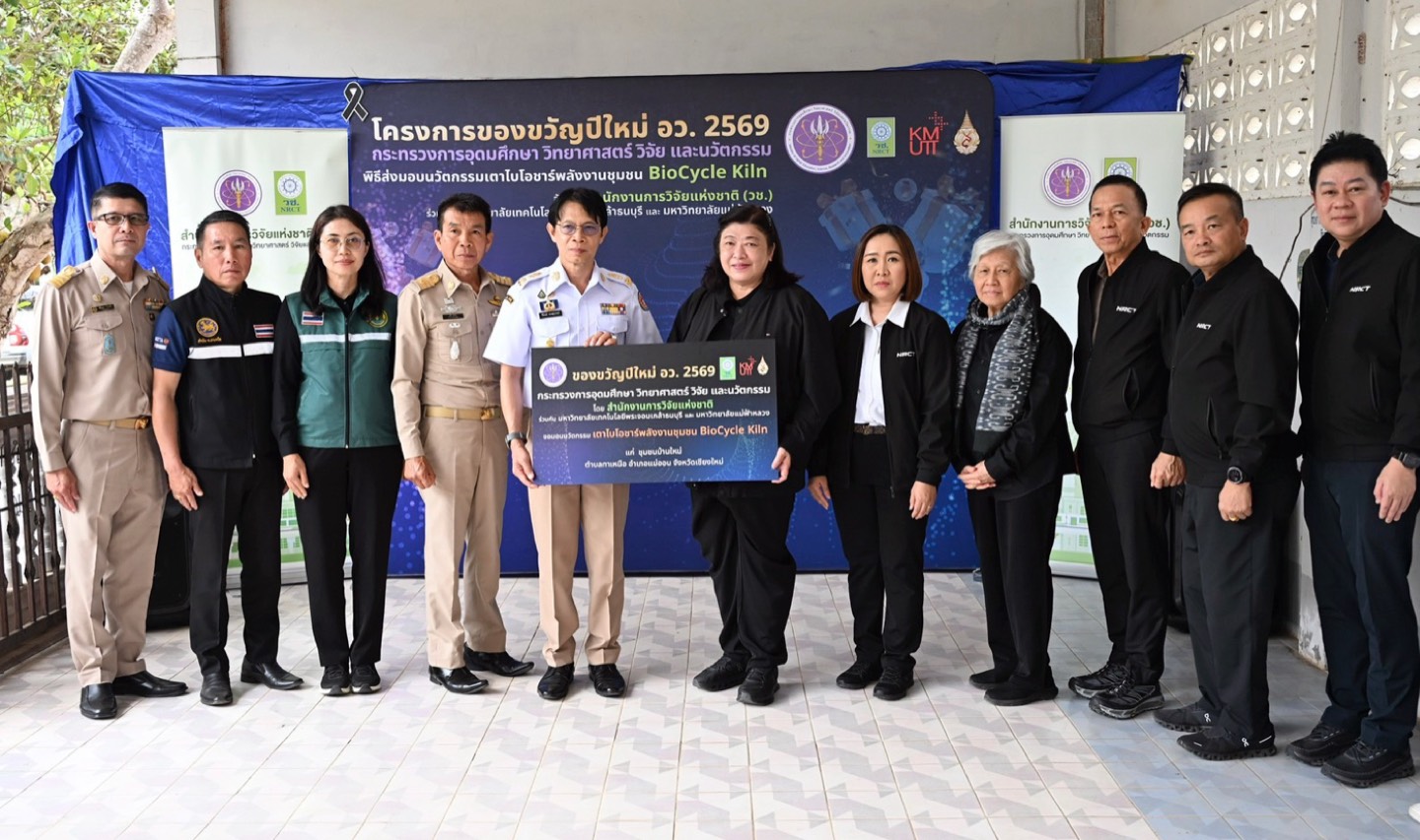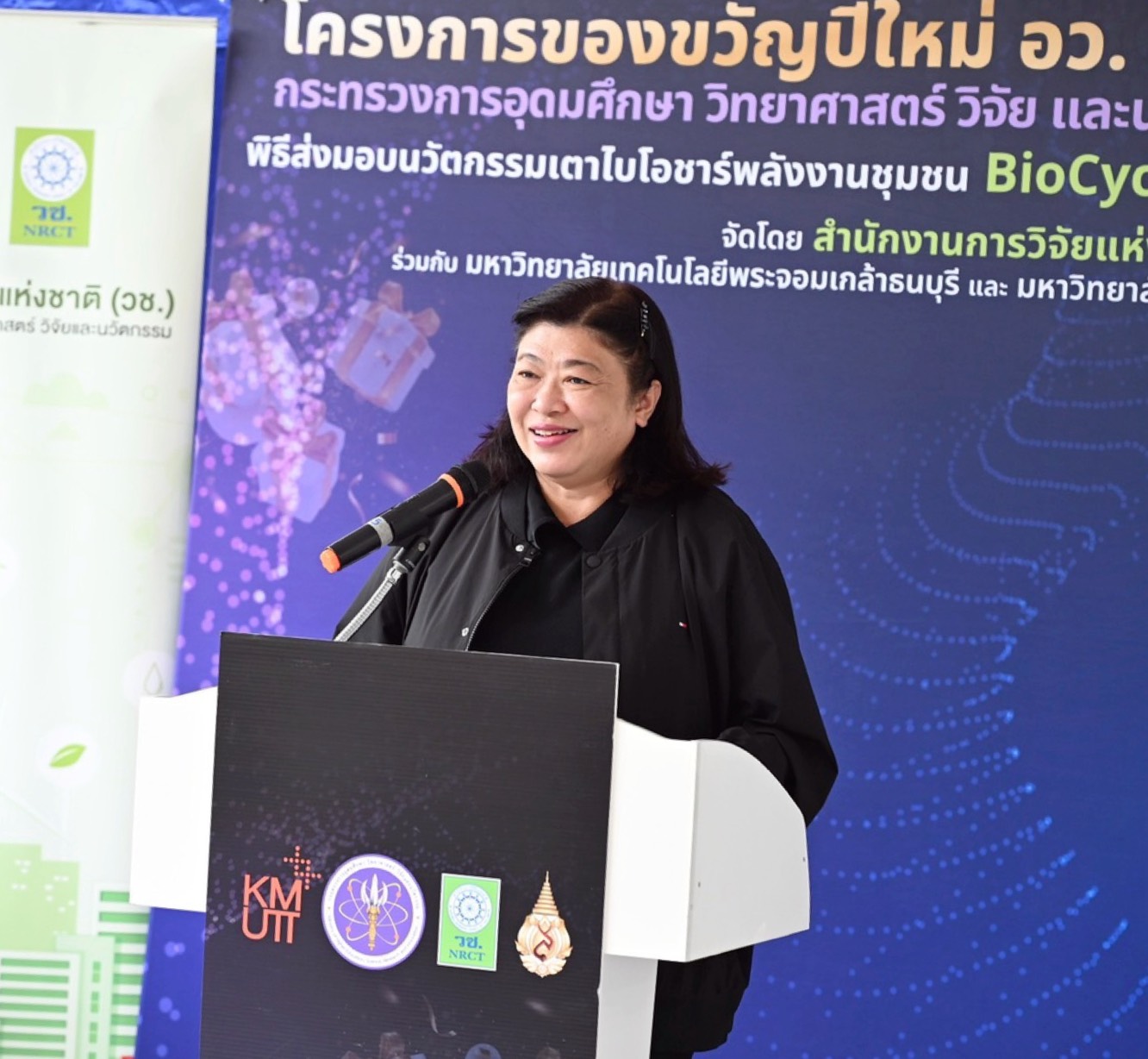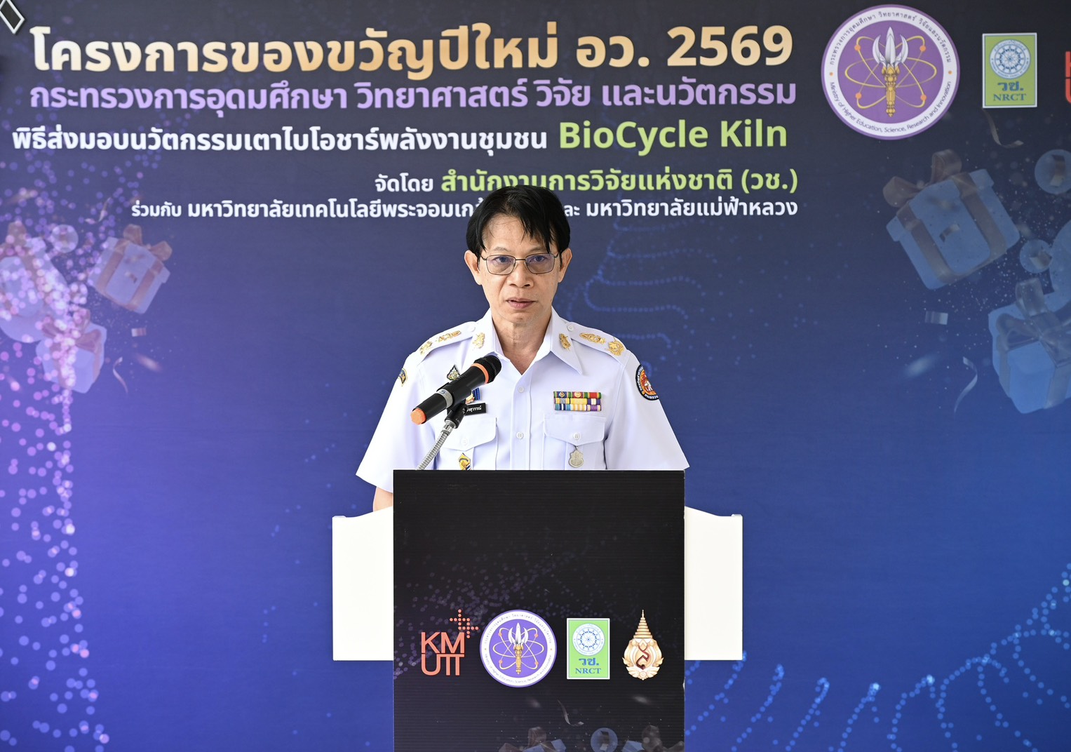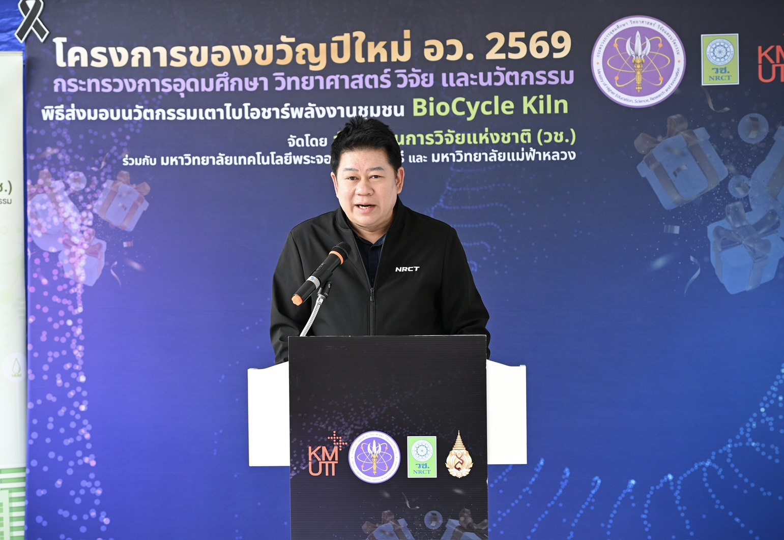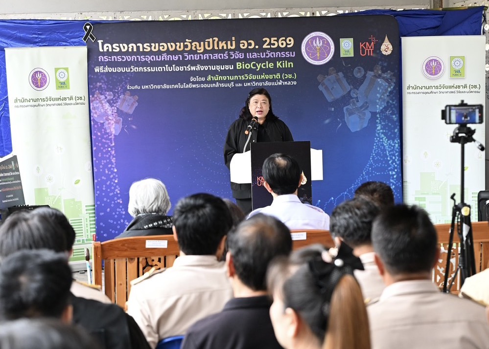 ดร.วิภารัตน์ ดีอ่อง ผู้อำนวยการสำนักงานการวิจัยแห่งชาติ กล่าวว่า ภายใต้โครงการ “ของขวัญปีใหม่ อว. 2569” เตาไบโอชาร์พลังงานชุมชน เป็นนวัตกรรมที่ วช. ให้การสนับสนุนในการพัฒนาแก่มหาวิทยาลัยเทคโนโลยีพระจอมเกล้าธนบุรีร่วมกับมหาวิทยาลัยแม่ฟ้าหลวง เพื่อเป็นกลไกสำคัญในการแก้ไขปัญหาฝุ่นละออง PM2.5 และลดการเผาในภาคการเกษตร โดยการดำเนินงานดังกล่าวควบคู่กับการถ่ายทอดองค์ความรู้และแนวทางการใช้งานสู่ชุมชน เพื่อให้เกษตรกรสามารถประยุกต์ใช้เทคโนโลยีในการจัดการเศษวัสดุเหลือทิ้งทางการเกษตรได้อย่างมีประสิทธิภาพ ก่อให้เกิดผลลัพธ์ที่วัดผลได้ ทั้งด้านการลดมลพิษทางอากาศ การฟื้นฟูคุณภาพดิน และการสร้างมูลค่าเพิ่มทางเศรษฐกิจ อันจะนำไปสู่การยกระดับคุณภาพชีวิตและเสริมสร้างความเข้มแข็งของชุมชน