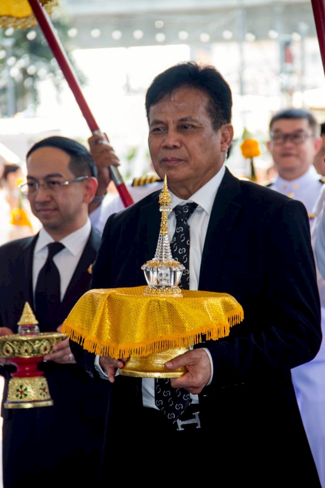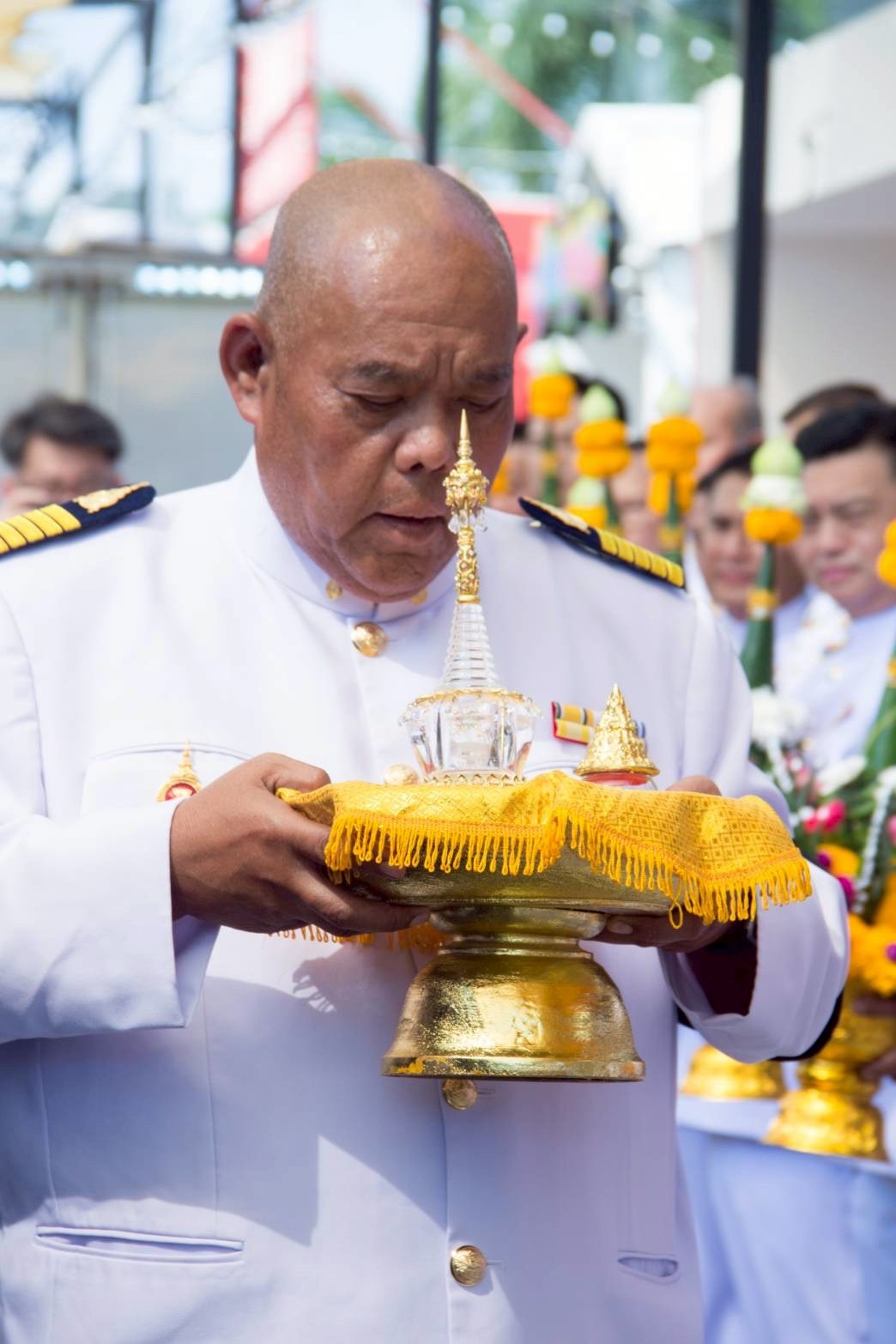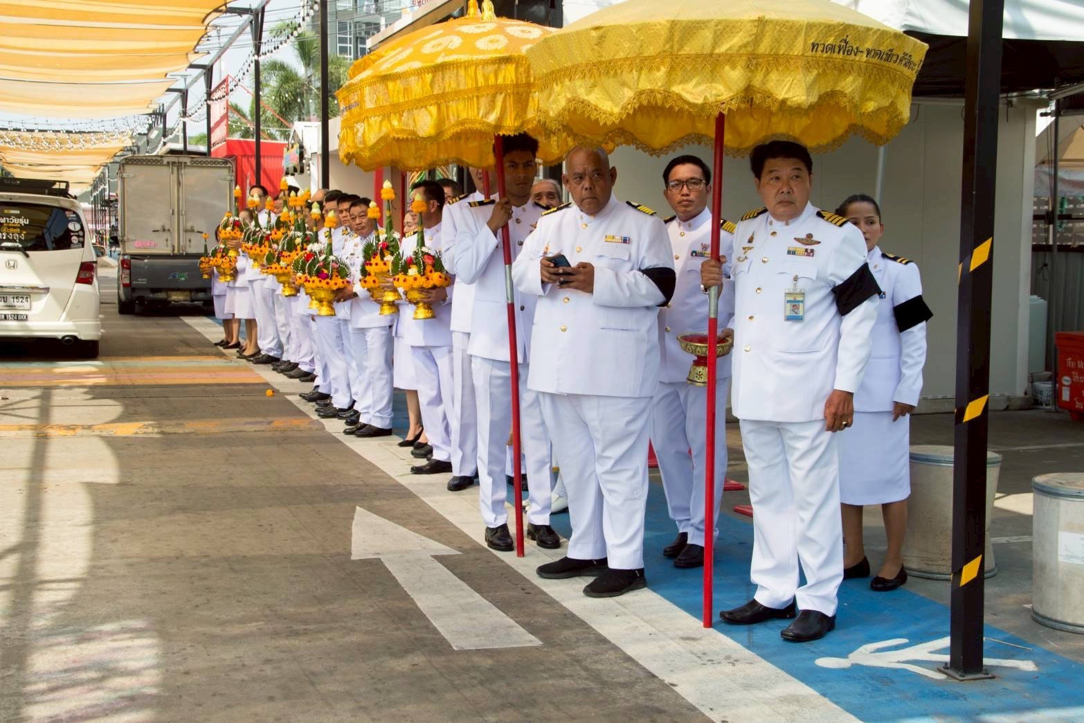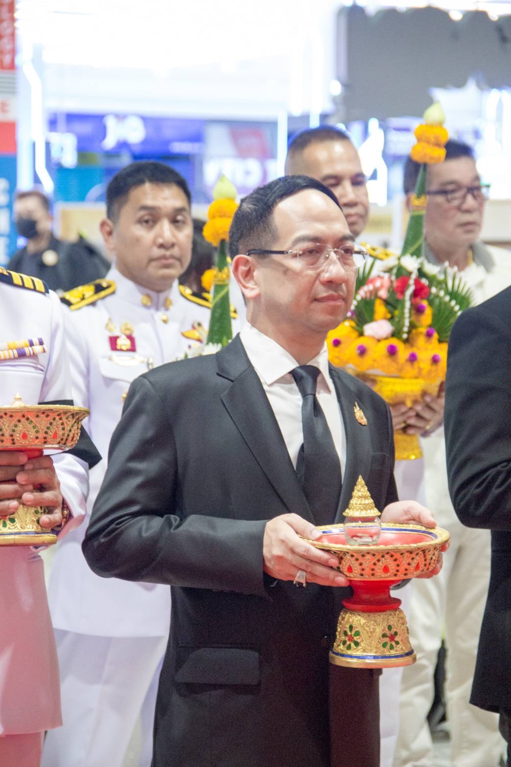 • ดร. ประกาย ณ สงขลา ถวายพานพุ่ม อัญเชิญเครื่องสูง เบื้องซ้ายเบื้องขวา